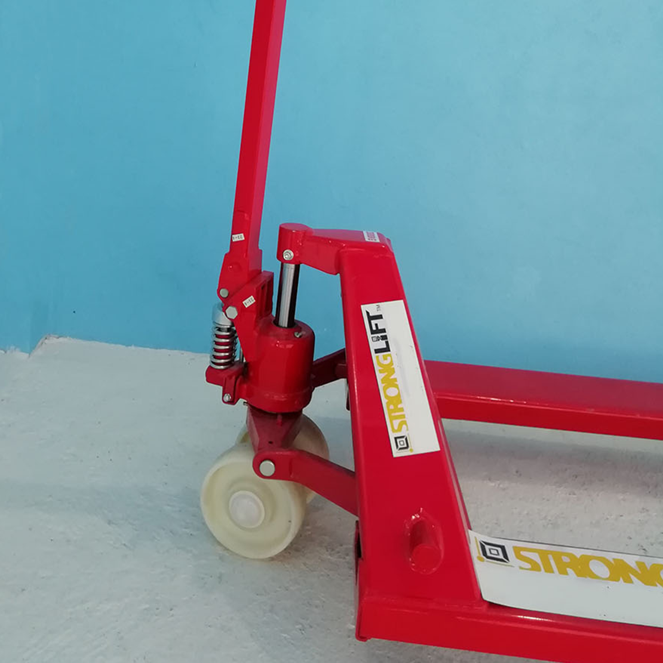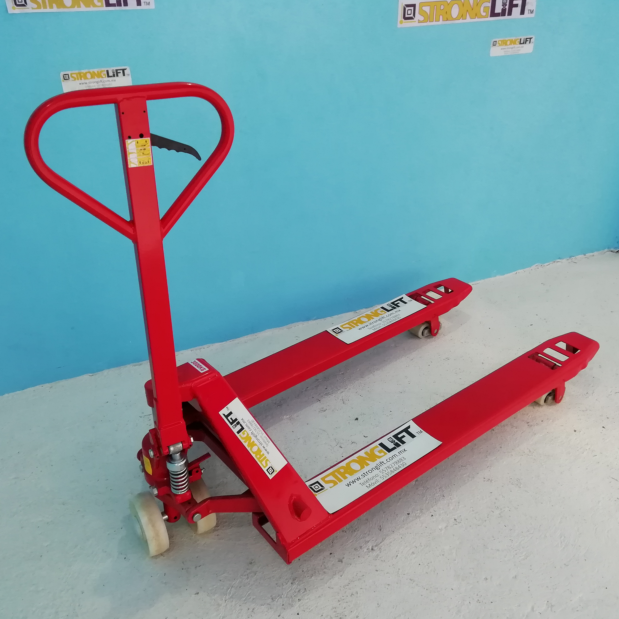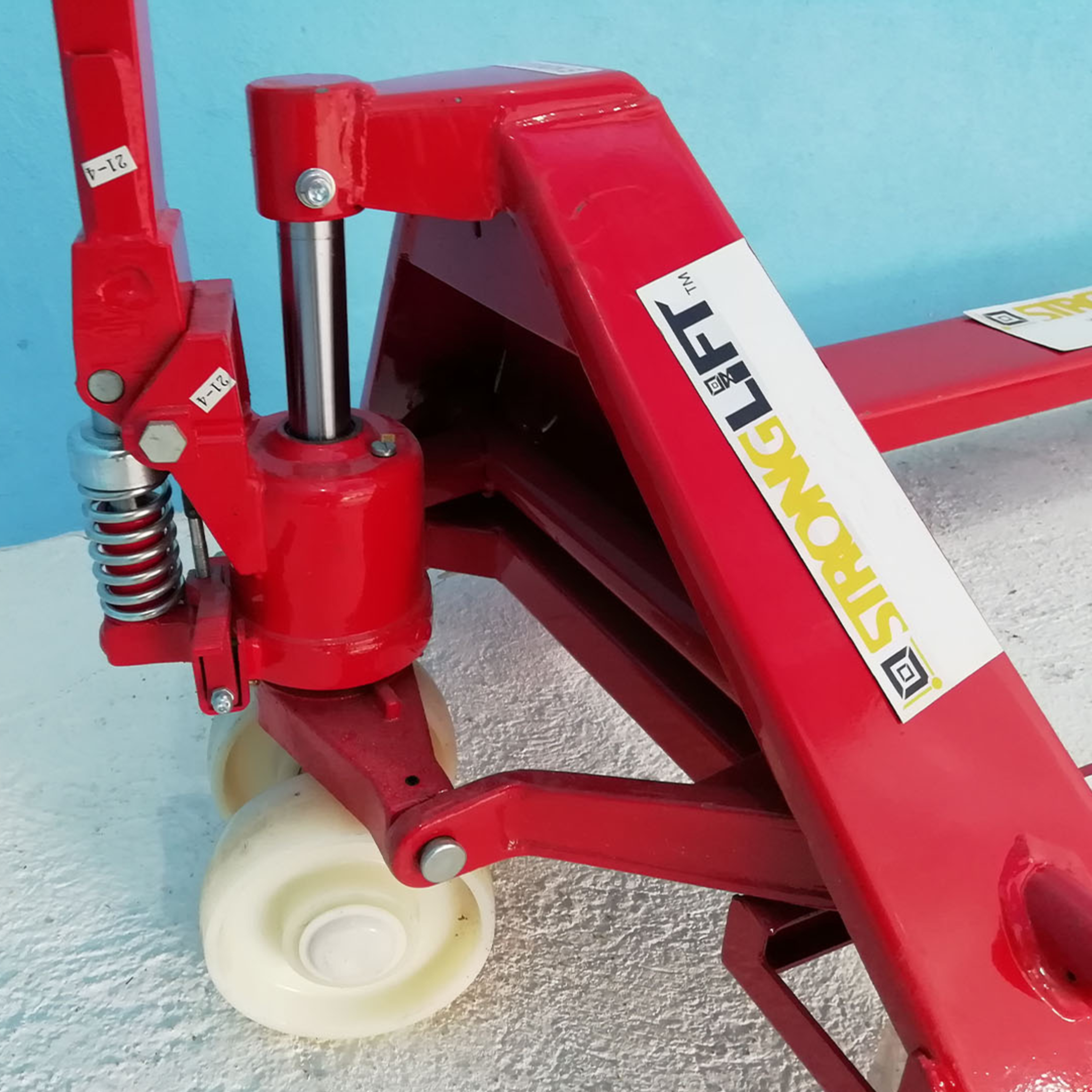 Patín estándar 3 toneladas de capacidad rojo gato tipo botella horquillas reforzadas 27”x 48” x 3” x 8” de levante ruedas de 7”x2” y tamden 3” x 2 3/16” hidráulico antigoteo control manual de 3 posiciones radio de giro 180°
