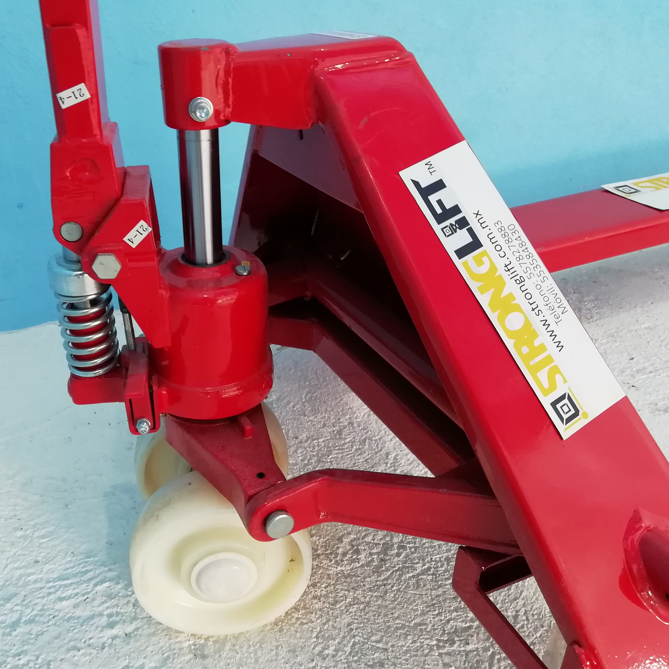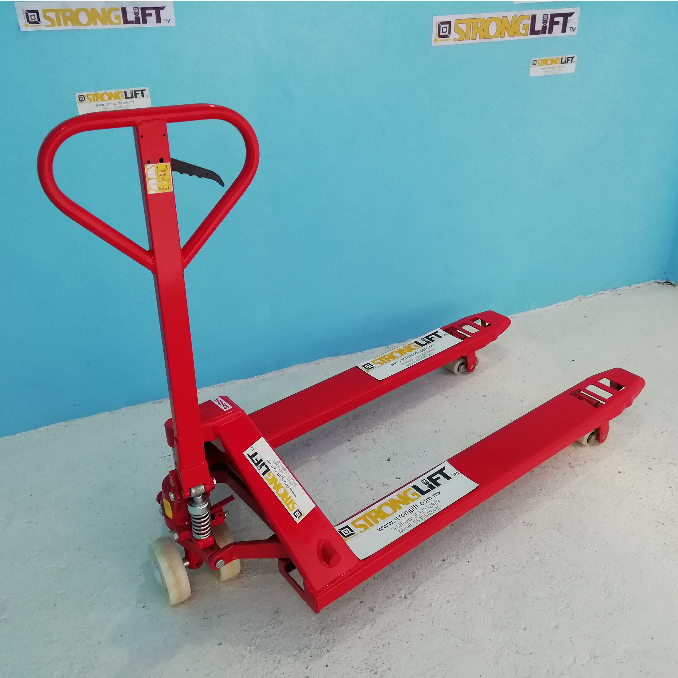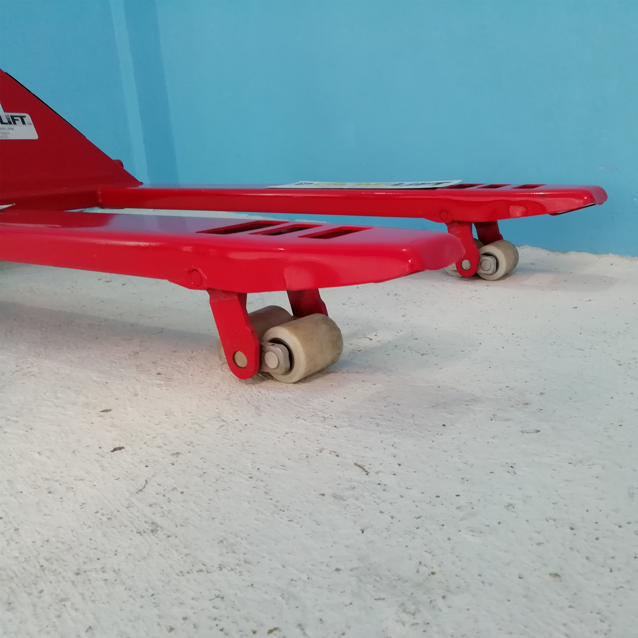 Patín Hidráulico perfil extra bajo 5.2 cms 1 ton. de capacidad llantas tandem nylamid horquillas reforzadas 27”x 48” x 2” x 6.38” de levante ruedas de 7” y tamden 2” hidráulico antigoteo control manual de 3 posiciones radio de giro 180°