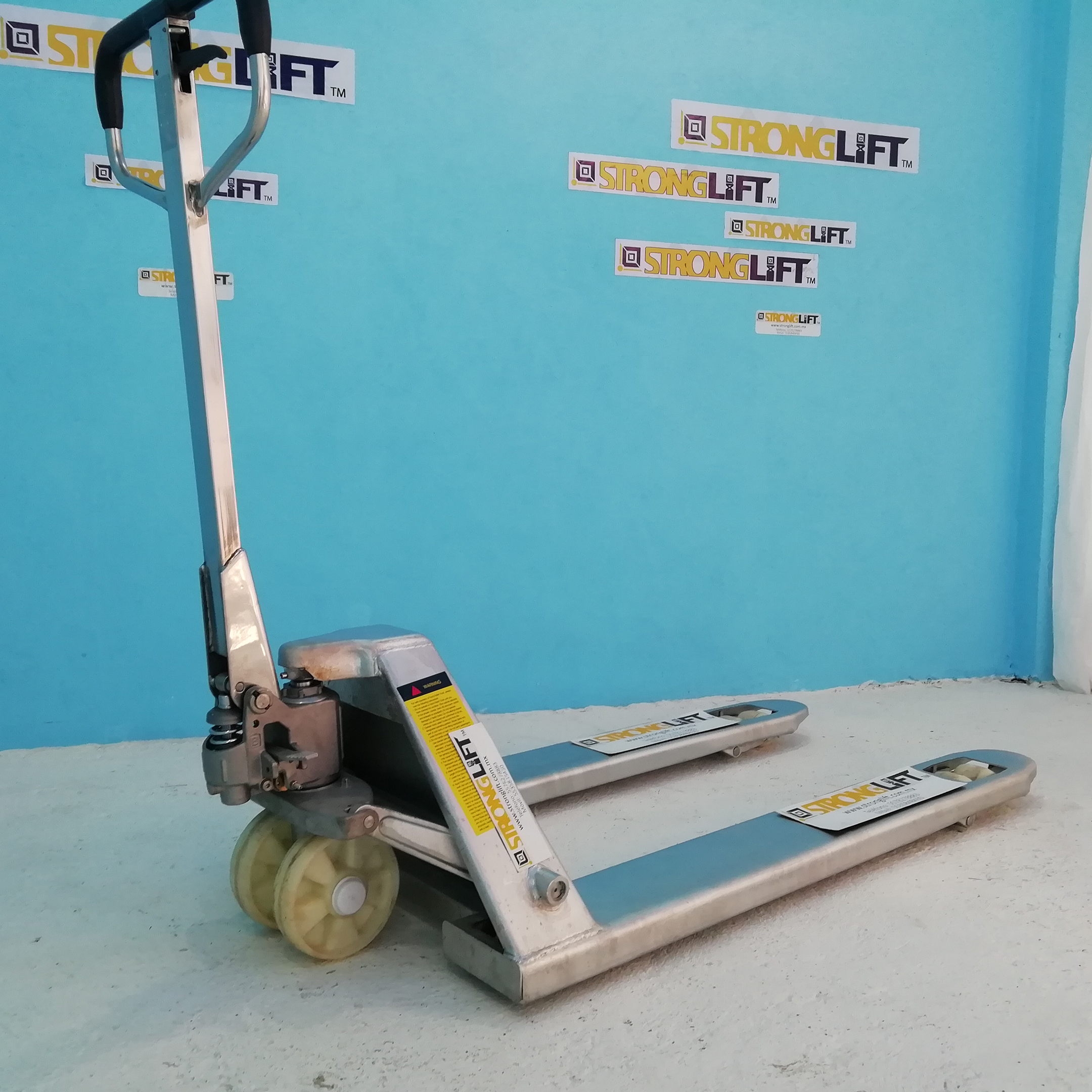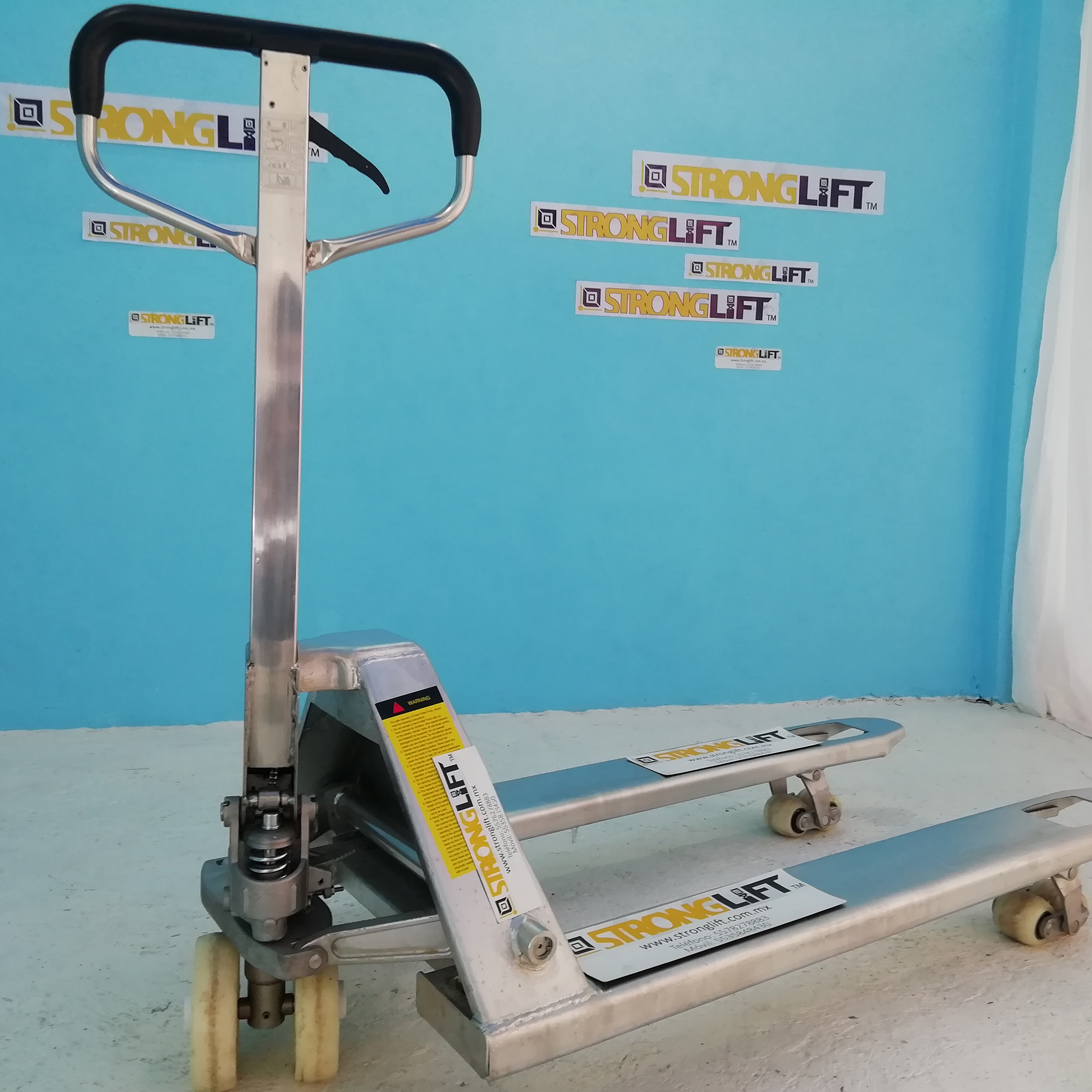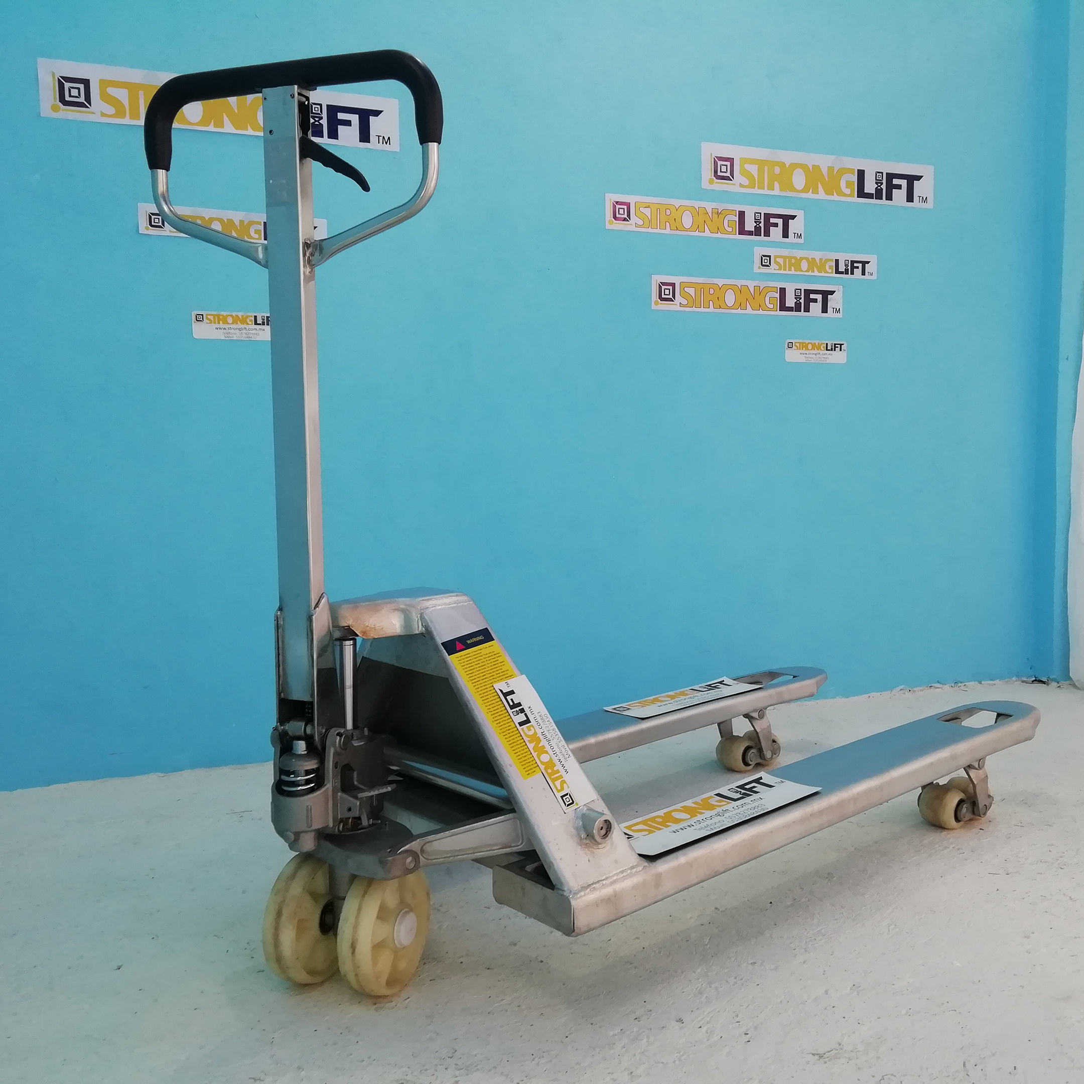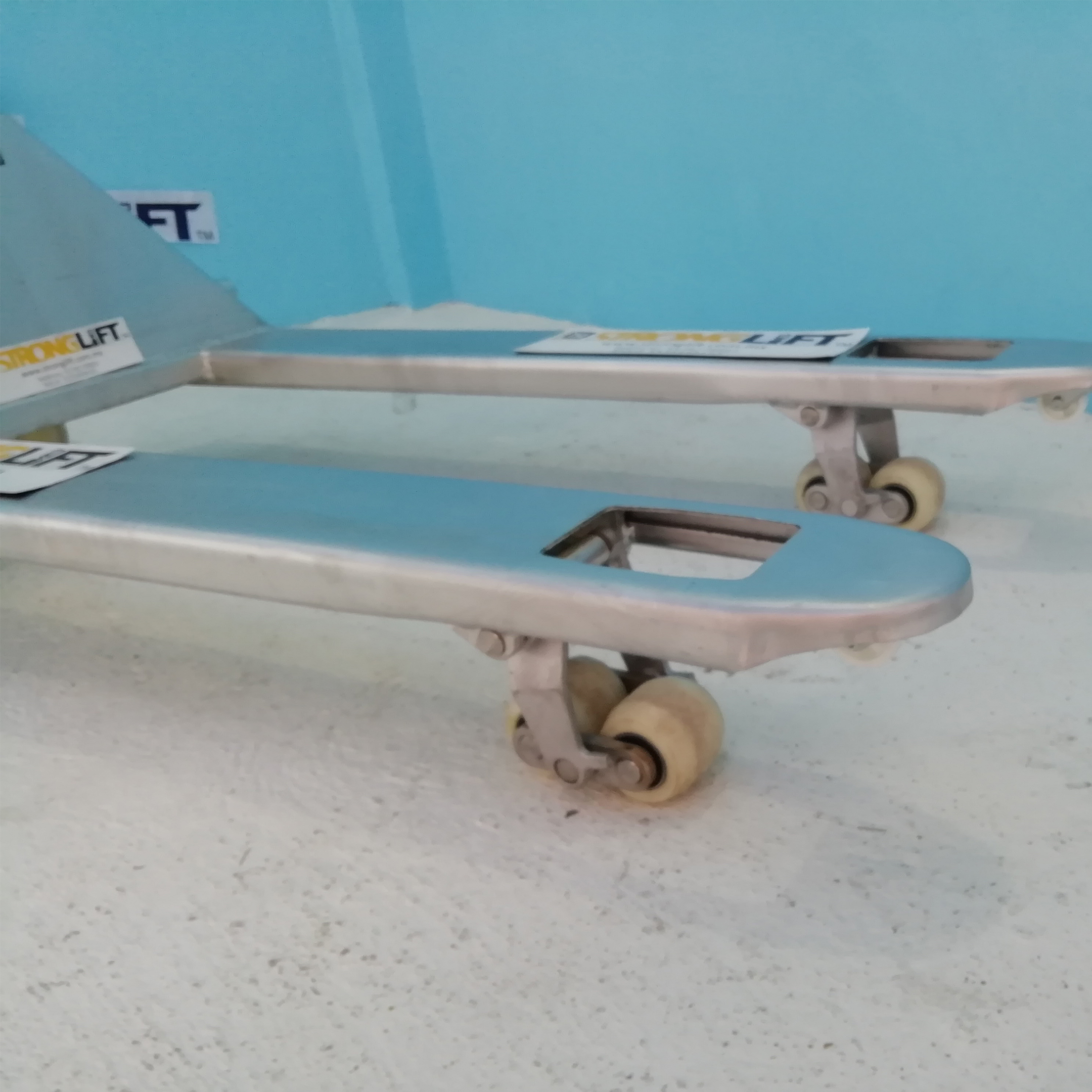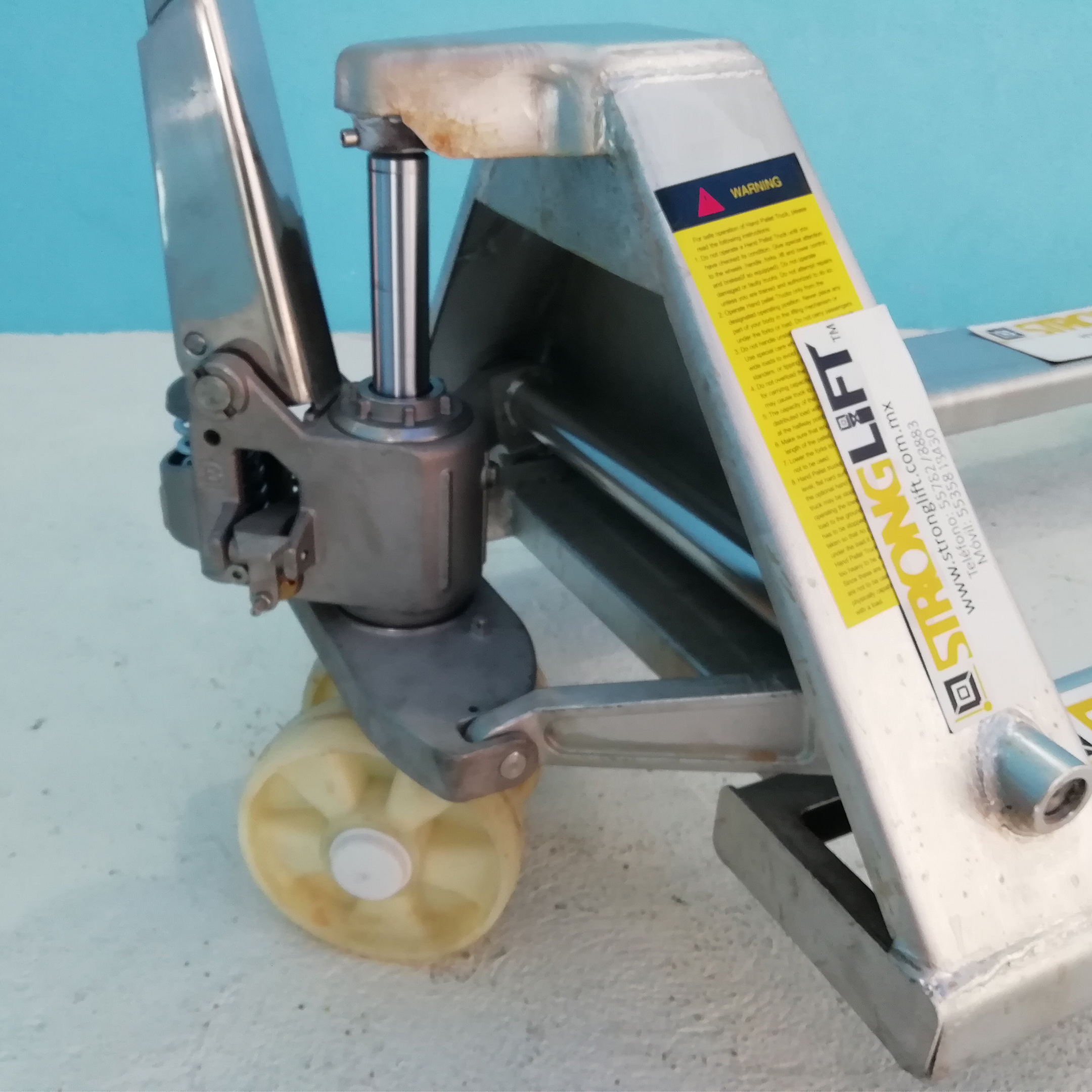 Patín estándar galvanizado 2.5 ton. de capacidad llantas tandem nylamid horquillas reforzadas 27”x 48” x 3” x 8” de levante ruedas de 7”x 2” y tamden 3”x 2 3/16” hidráulico antigoteo control manual y posiciones radio de giro 180°