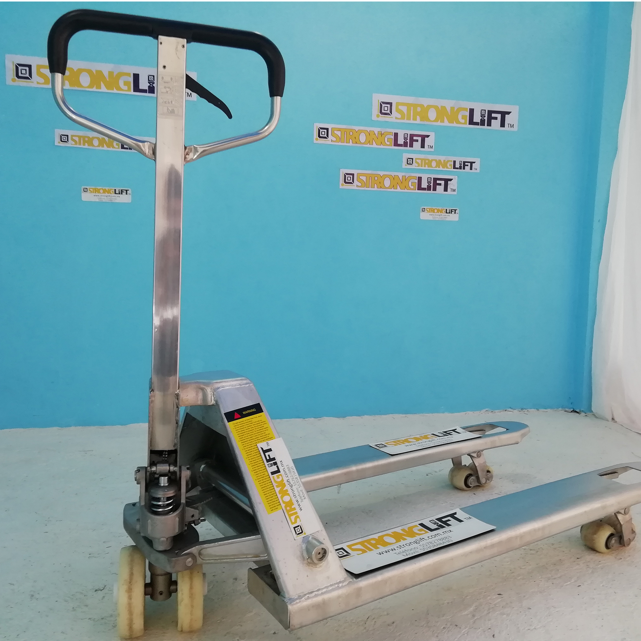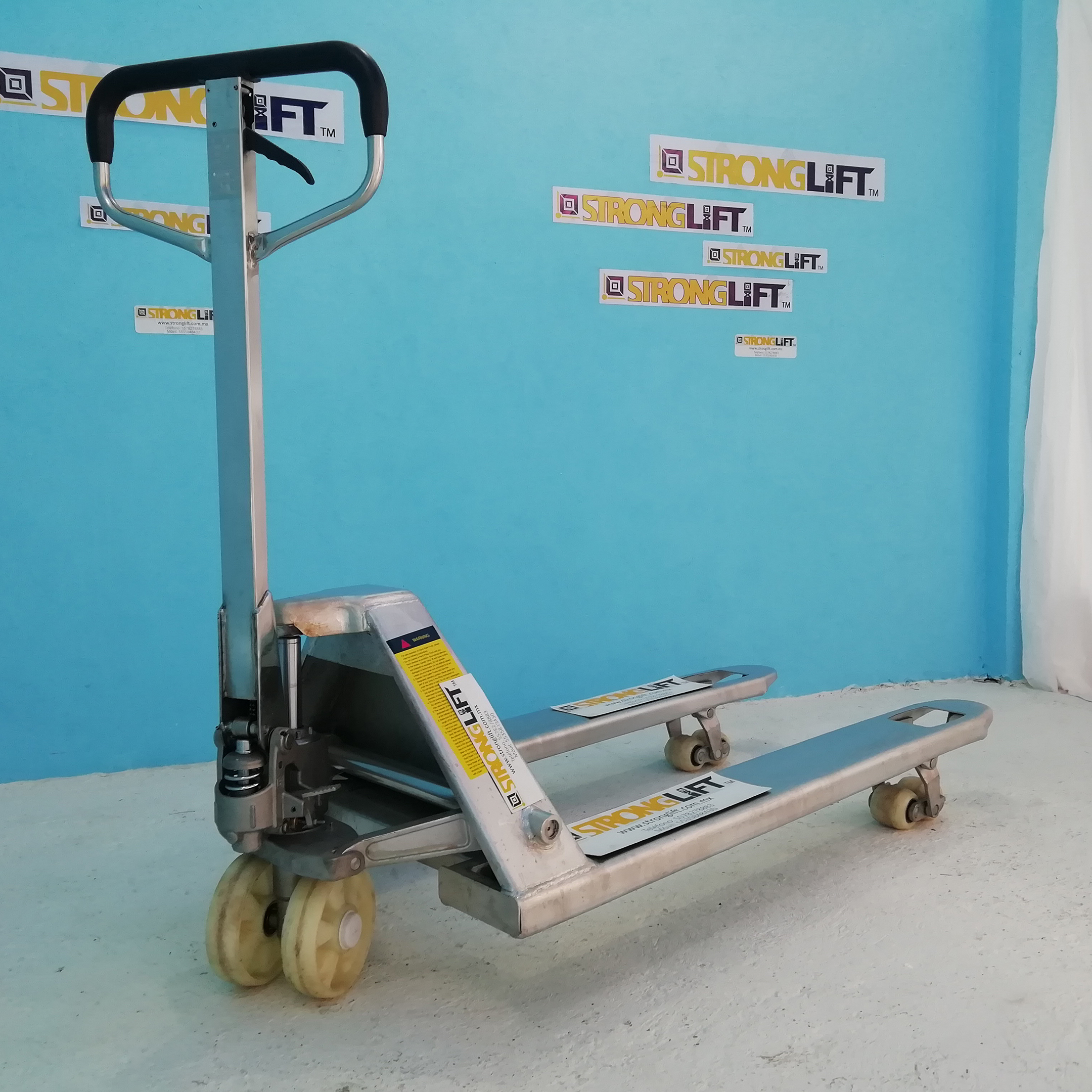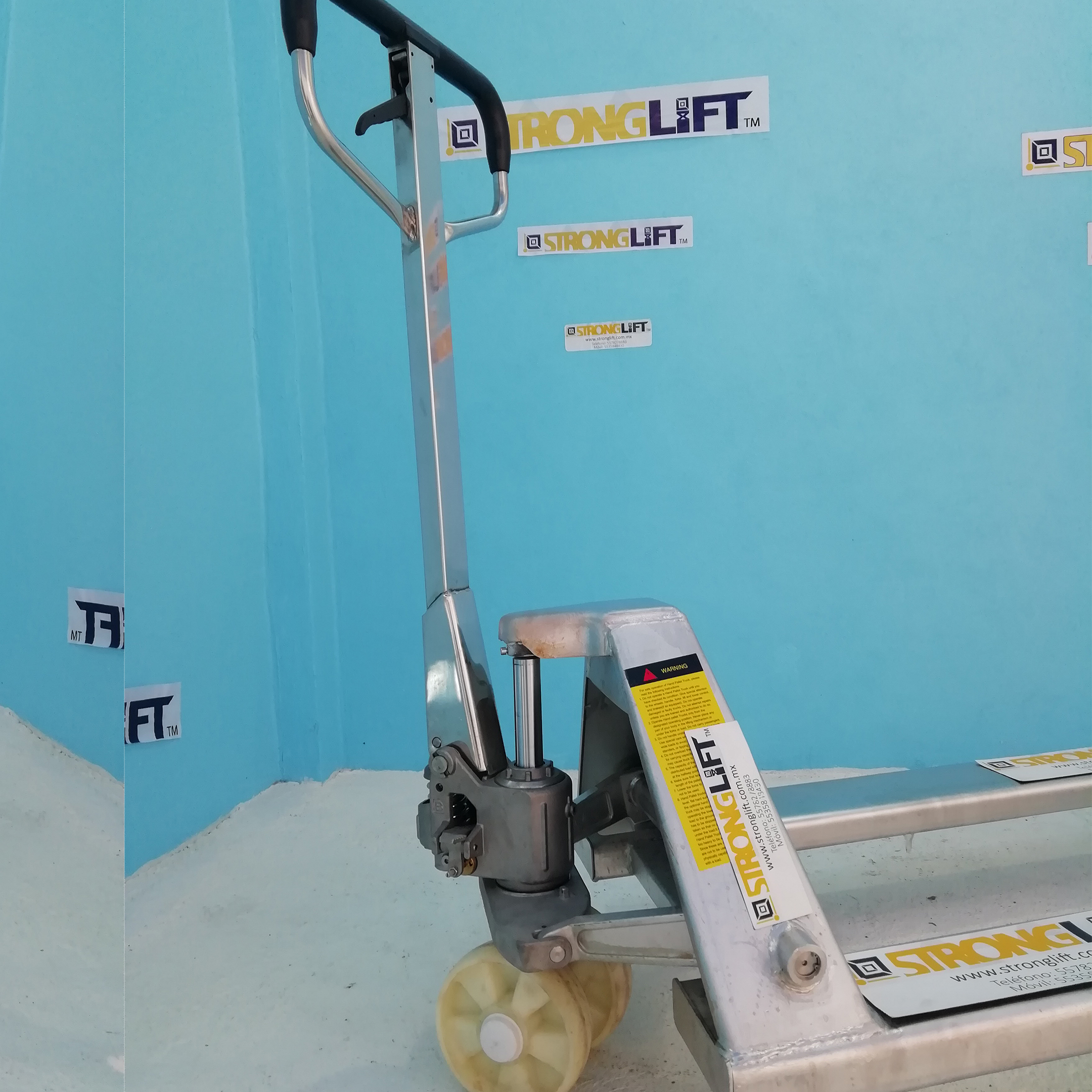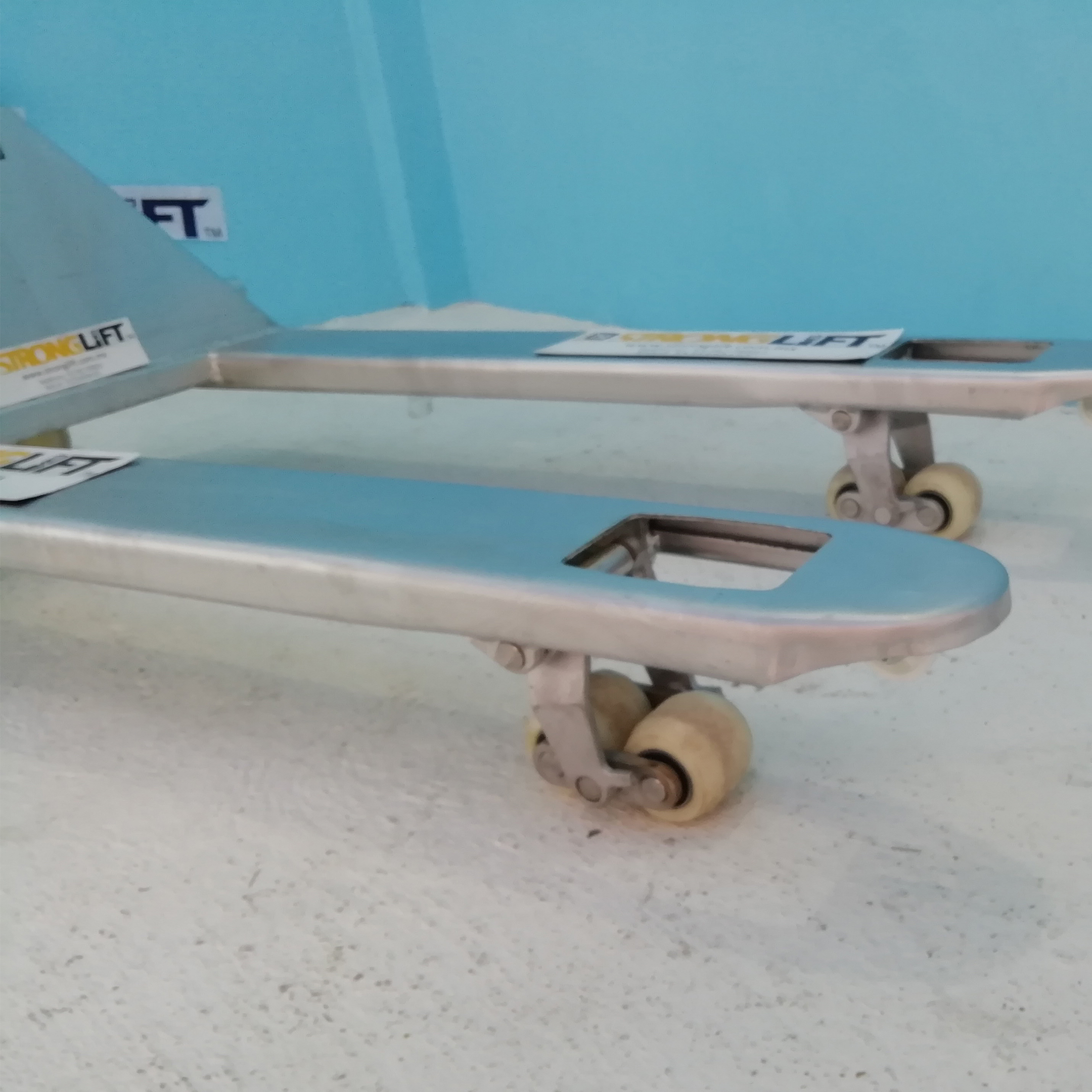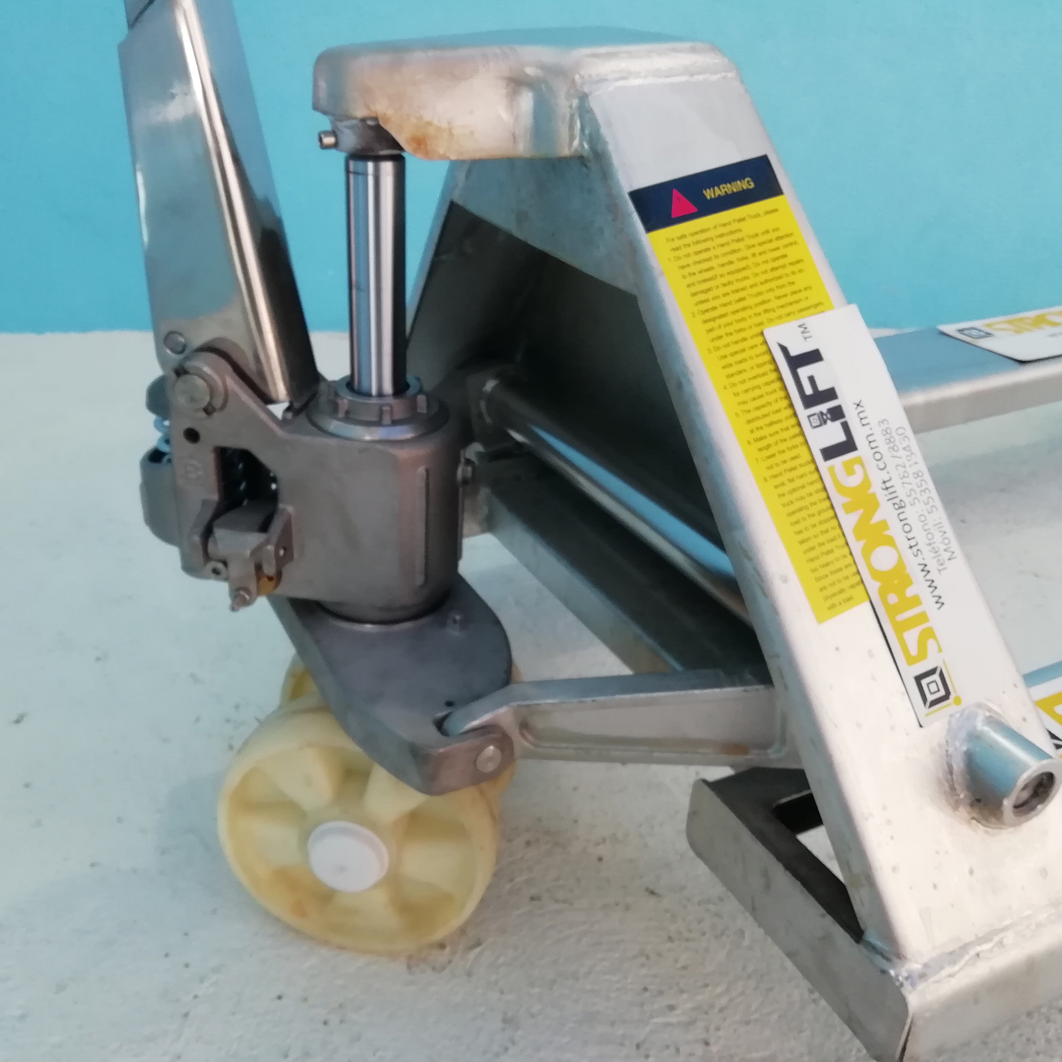 Patín Hidráulico estandar 2 toneladas de capacidad de carga acero inoxidable llantas tanden nylamid horquillas reforzadas 27” x 48” x 3” x 8” de levante ruedas de 7” y tamden 3” hidráulico antigoteo control manual de 3 posiciones radio de giro 180°