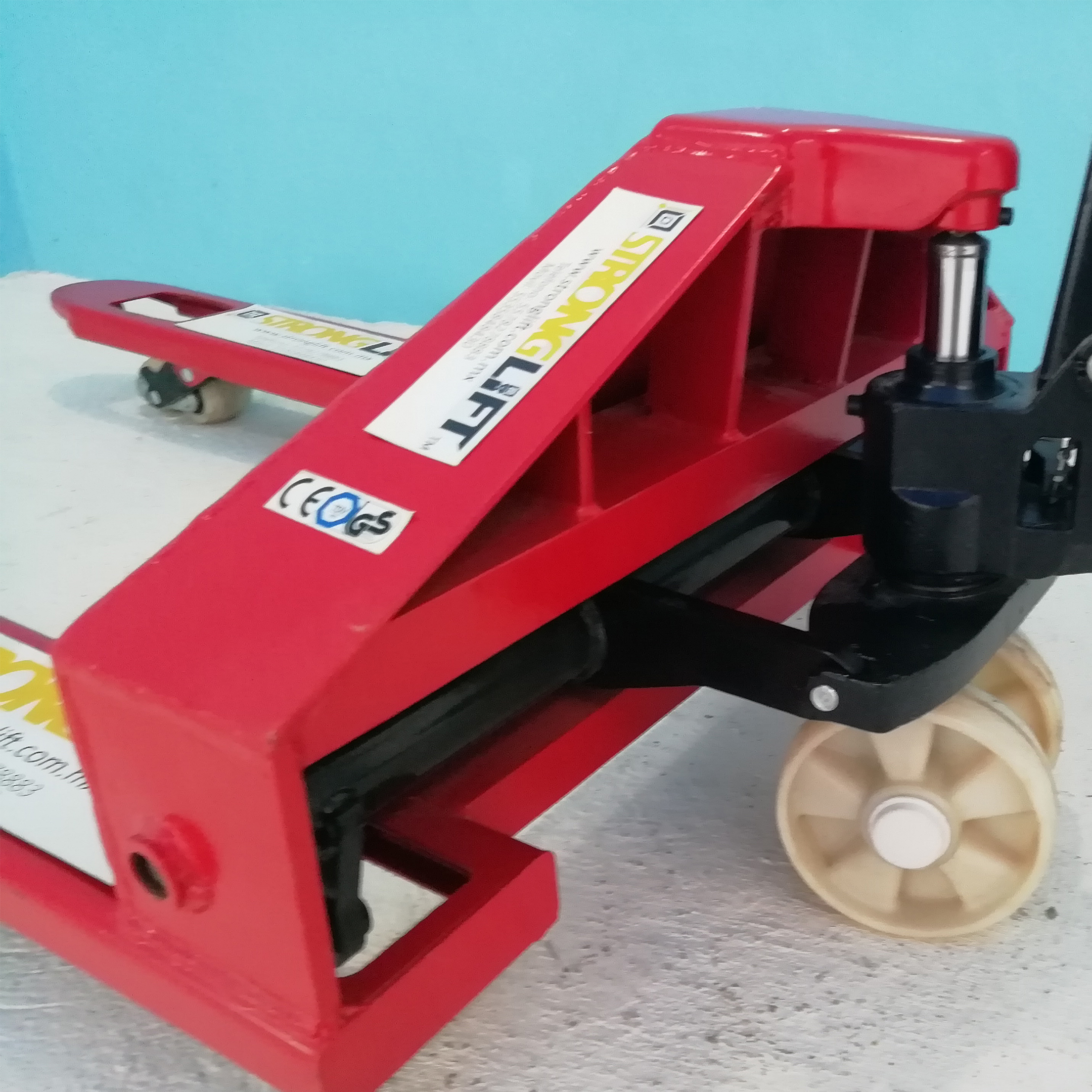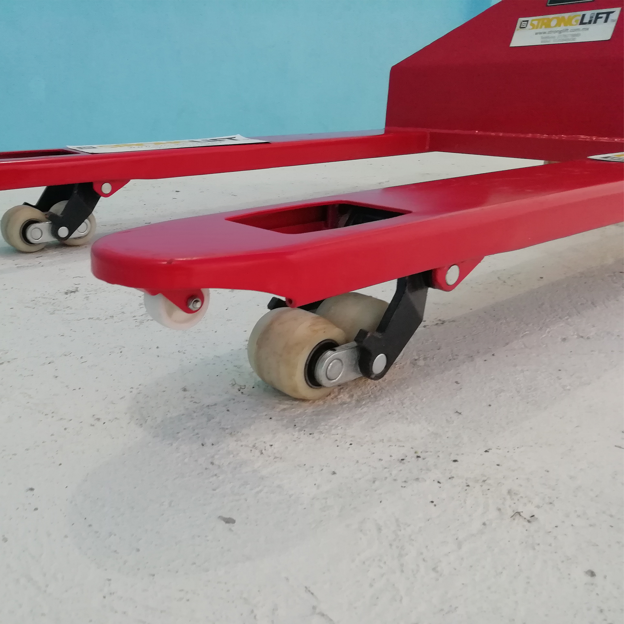 Patín ancho (batman) perfil normal 3 toneladas de capacidad horquillas reforzadas 33”x 48” x 3” x 8” de levante ruedas de 7” y tamden 3” x 2 3/16” hidráulico antigoteo control manual de 3 posiciones radio de giro 180°