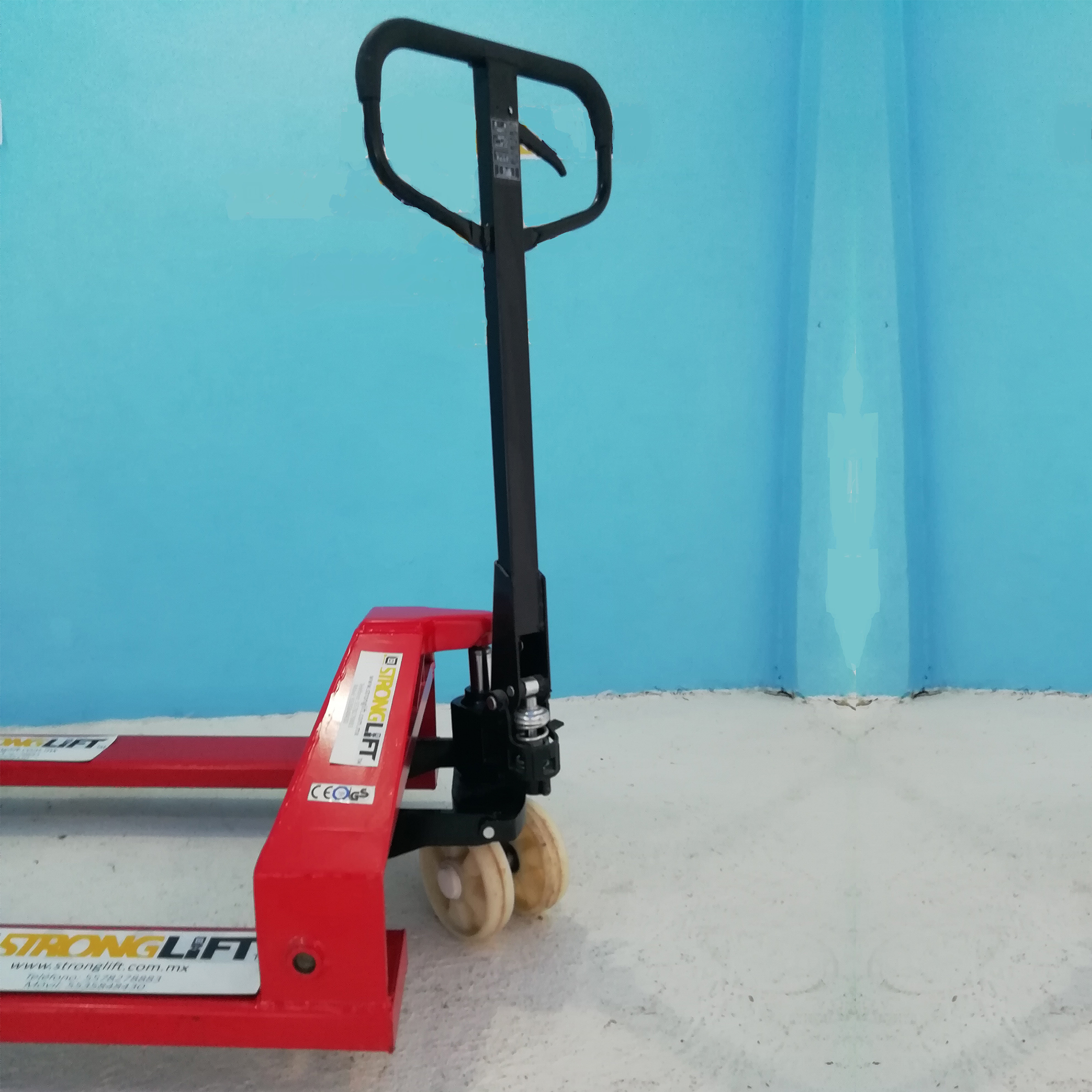 Patín ancho (batman) perfil bajo 6.5 cms 3 toneladas de capacidad horquillas reforzadas 33”x48” x 3” x 8” de levante ruedas de 7” y tamden 3” x 2 3/16” hidráulico antigoteo control manual de 3 posiciones radio de giro 180°