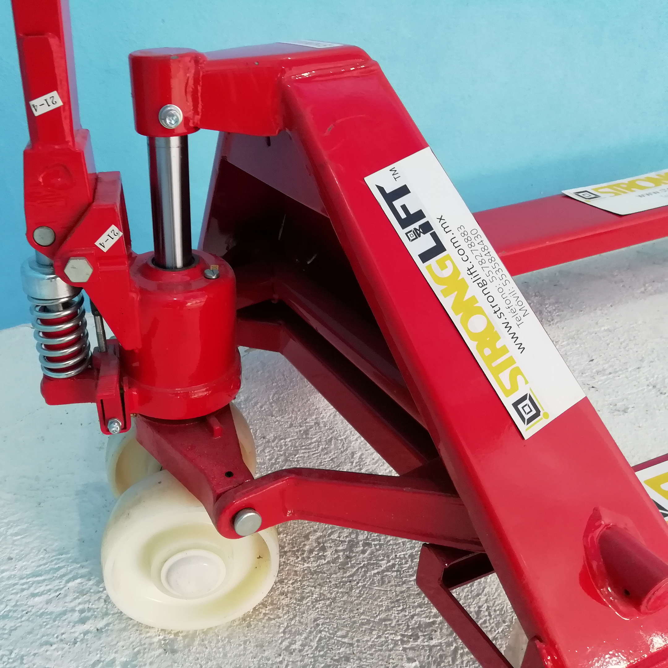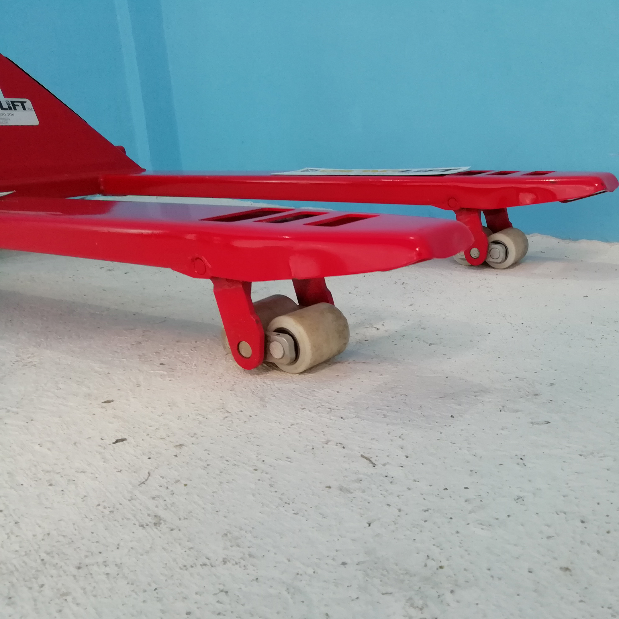 Patin corto 3 toneladas de capacidad horquillas reforzadas 27”x42” x 3” x 8” de levante ruedas de 7”x2” y tamden 3” x 2 3/16” hidráulico antigoteo control manual de 3 posiciones radio de giro 180°